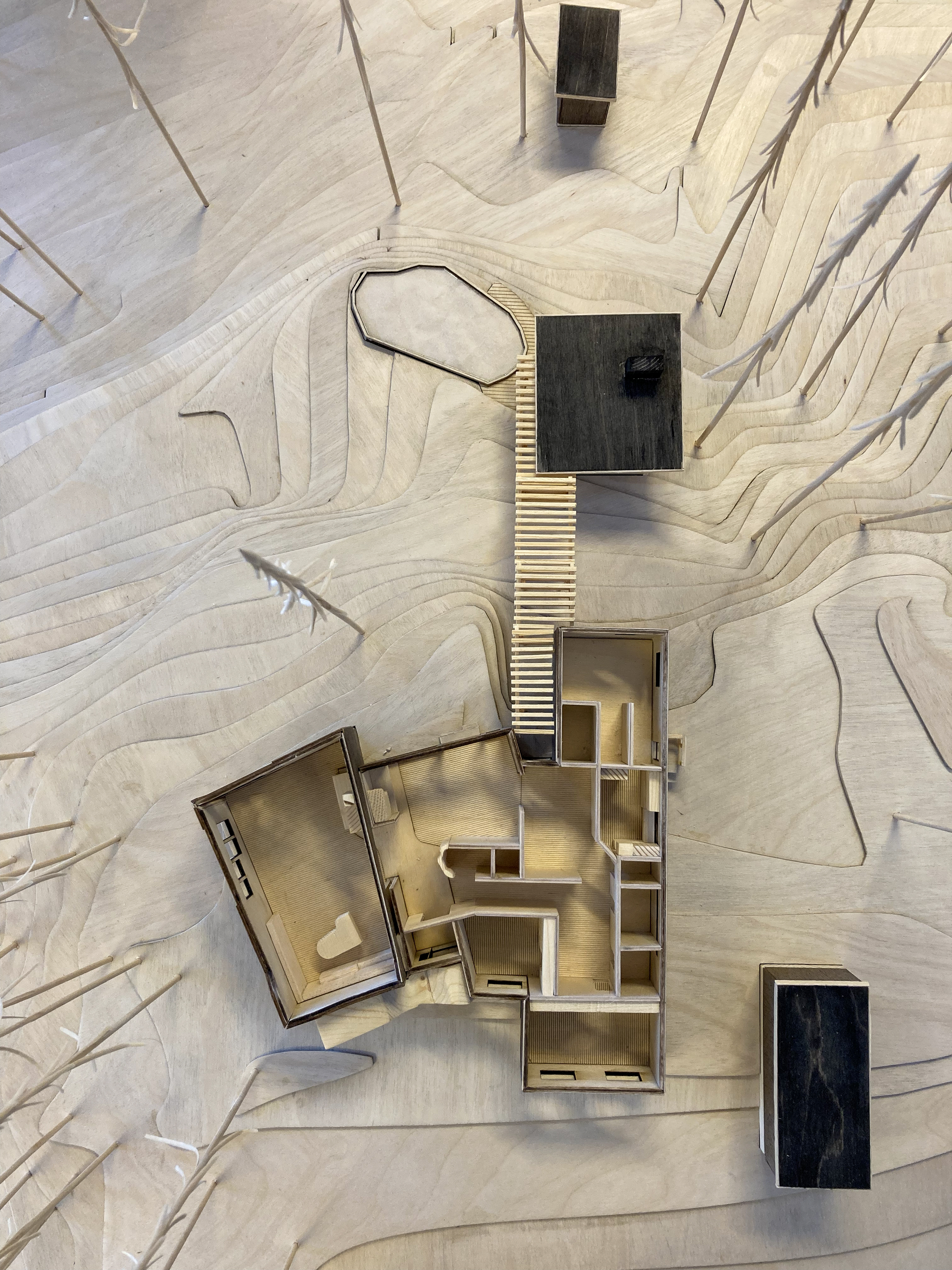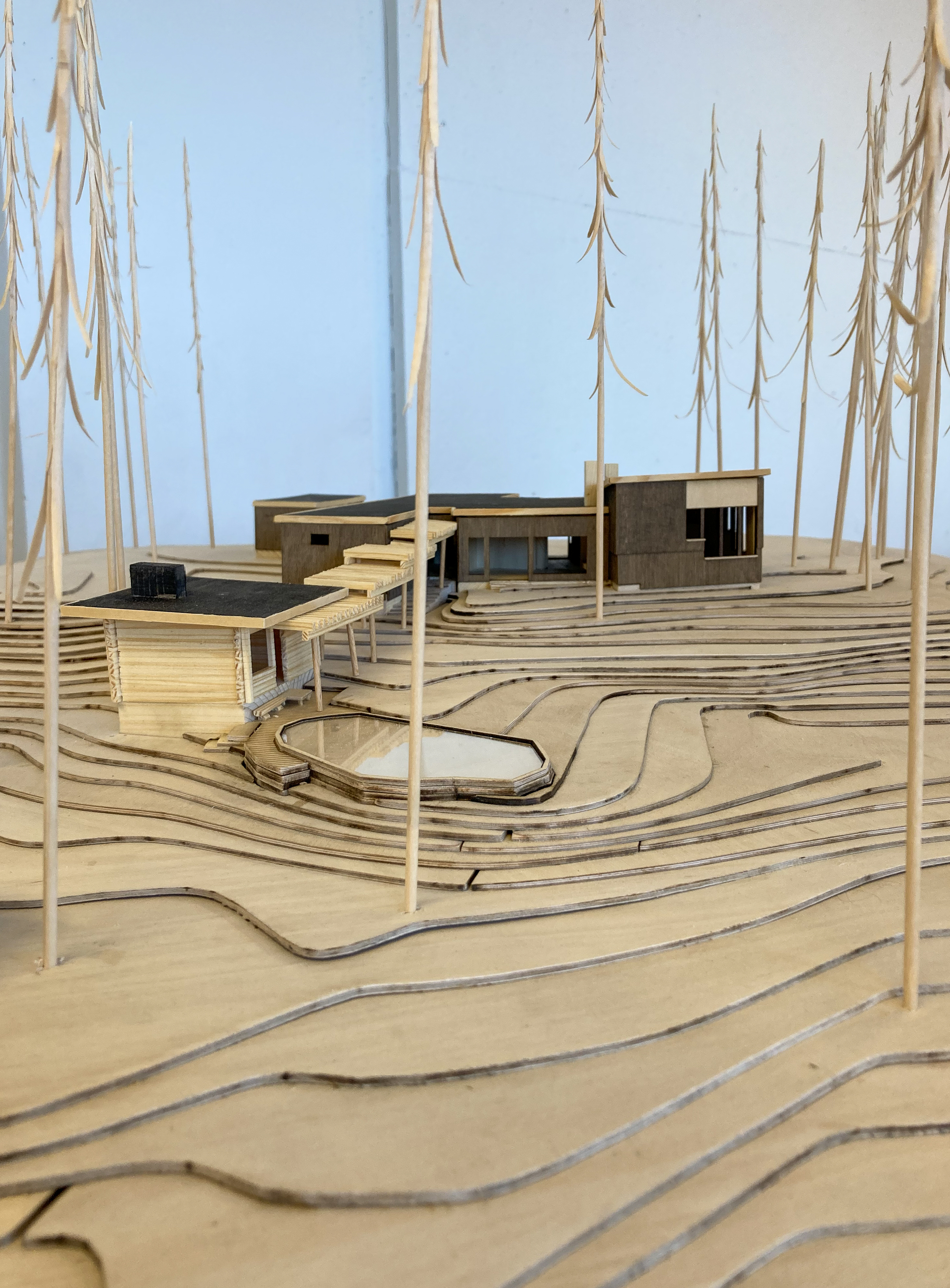 (interior and exterior) of the villa, sauna, and site were measured and triangulated using traditional water level tubes, meter sticks, and string. From these measurements, multiple hand drawings and a model were produced which include site, plan with furniture, elevation, and section. More than 2,000 points were recorded on the site alone with all 200 plus trees and a full interior drawn and modelled accurately.
