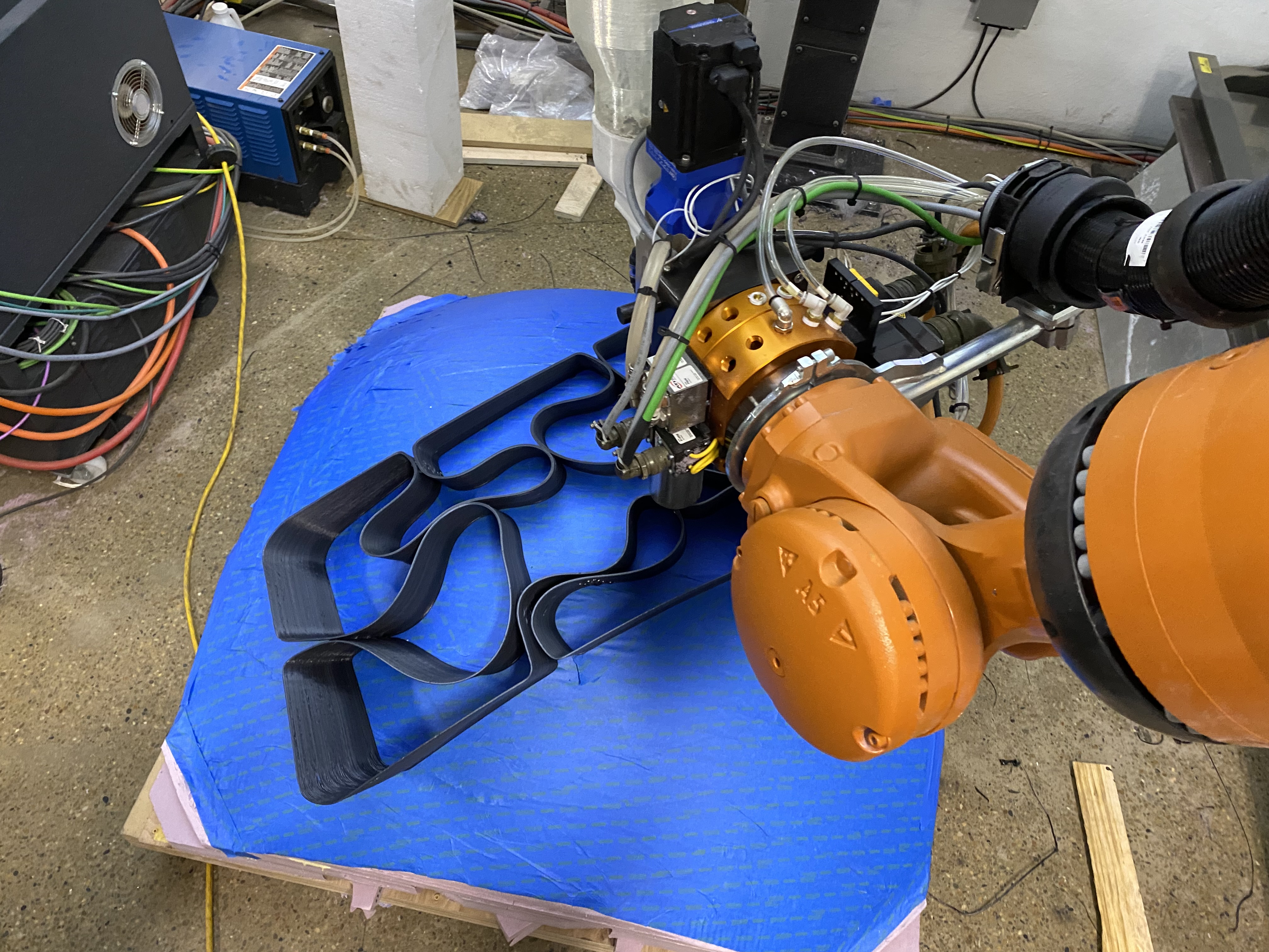 Traditional 3D-printing uses a planar workflow where the print bed and all subsequent print layers are flat and parallel. This process does not take full advantage of additive manufacturing. In this project, early research investigations looked for ways that this planarity could be broken in order to take advantage of a multi-axis KUKA setup. This involved the development of large scale 3D-printed components which were reinforced with a composite membrane.