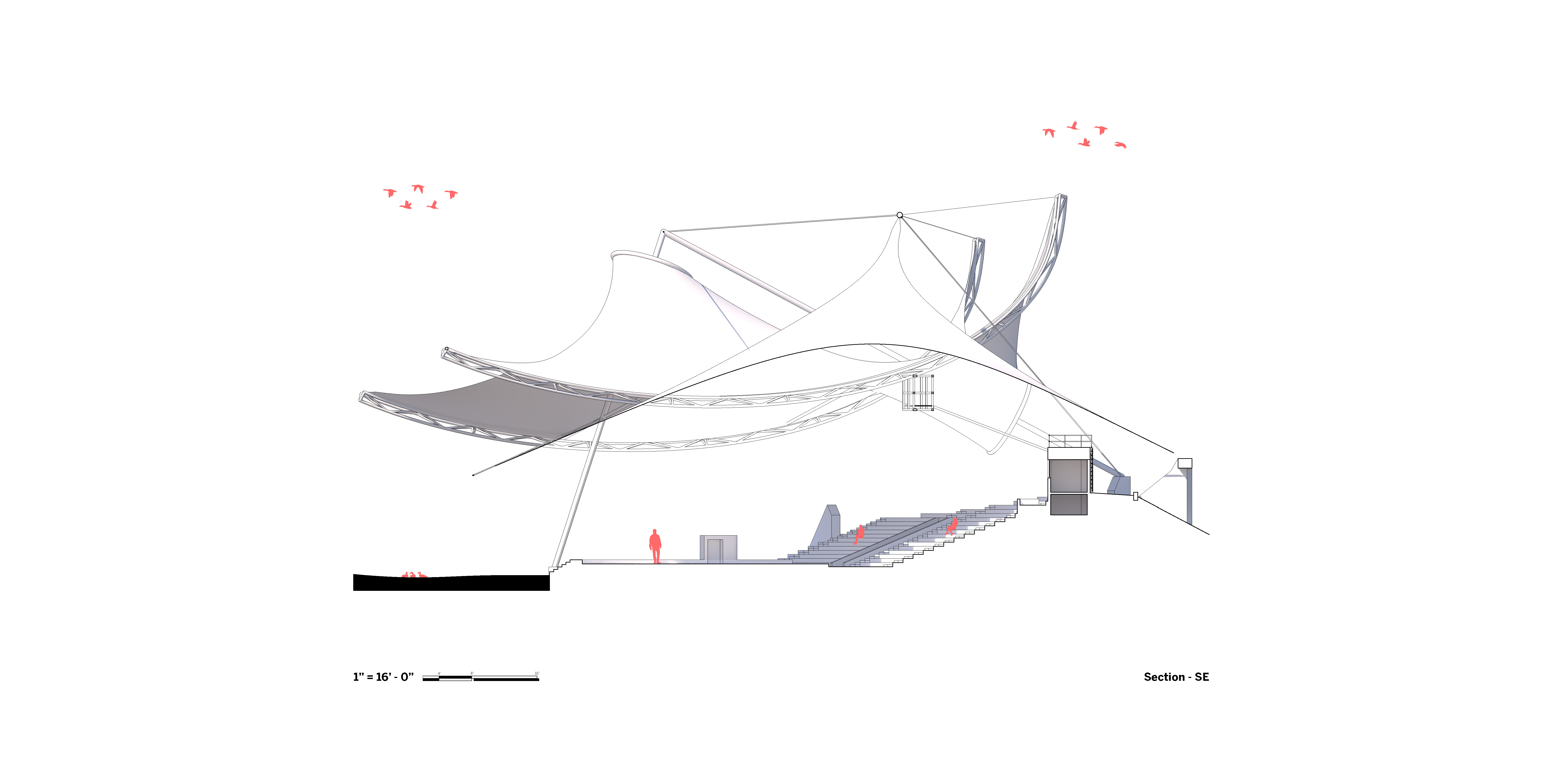 Redesiging the Worlds Fair Park Amphitheater also required understanding these systems in the application of large tensile structures. The design tested here drew inspiration from the Rosa Parks Transit Terminal in Detroit, MI. The tensile fabric and structural steel frame were also run through a Kangaroo script to document stresses within the system.